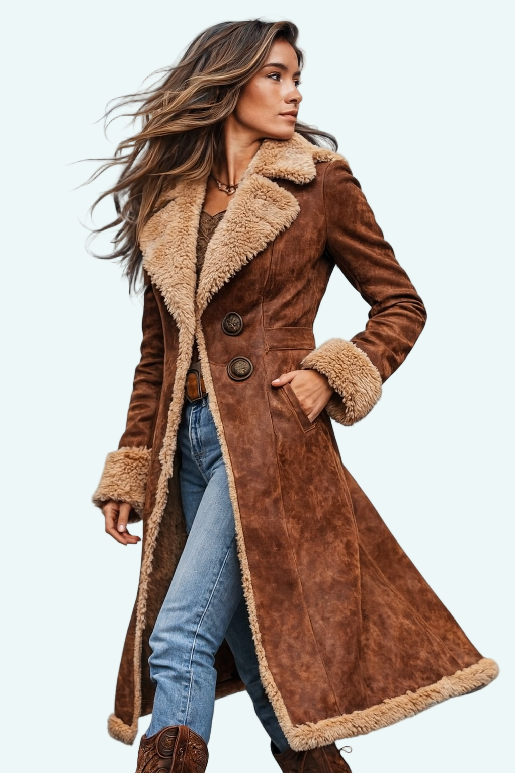 En hyllning till vintageelegans och vild värme. Denna långa kappa, med fluffigt foder i fuskpäls och en mjuk finish, erbjuder en poetisk balans mellan sofistikering och komfort. Den utsvängda silhuetten förlänger figuren, medan de kontrasterande texturerna väcker en känsla av frihet och raffinerad kvinnlighet. Ett exceptionellt plagg som förvandlar varje utflykt till en elegant flykt.