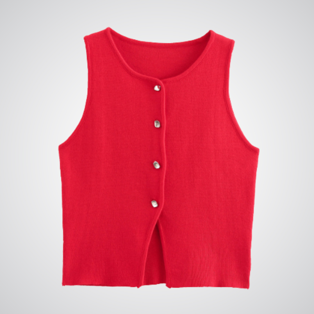 Modern, enkel och perfekt för varma dagar – Margaux™-västen ger din garderob en uppfriskande touch med sin djärva röda färg och lätt tvättade look. De dekorativa knapparna och den avslappnade passformen gör den till ett perfekt lagerplagg över T-shirts eller linnen – användbar från vår till höst.